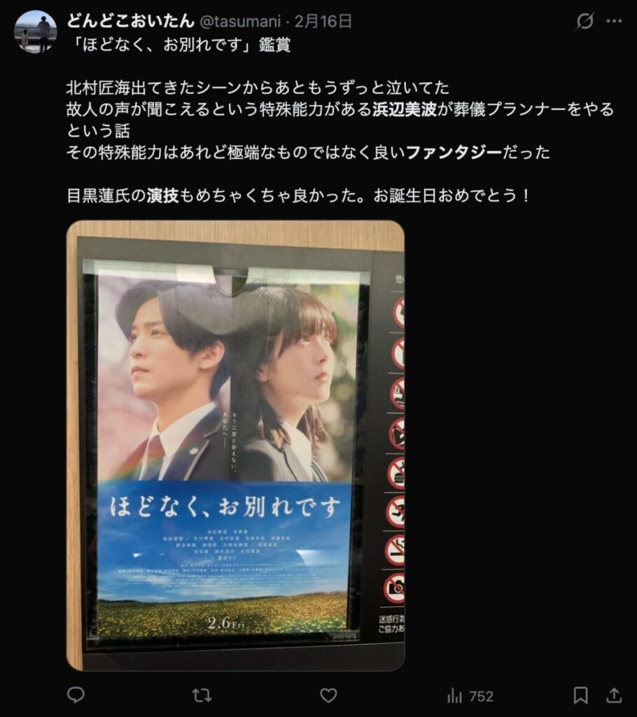 映画『ほどなく、お別れです』では、浜辺美波さんの演技が「自然すぎる」と受け取られる場面があったようです。派手な感情表現よりも、抑えた声のトーンや視線の動きで心情をにじませる芝居が印象に残ったという声がある一方で、もう少し強い表現を期待したという意見も見られました。こうした“静かな演技”が、評価を分ける一因になったと考えられます。