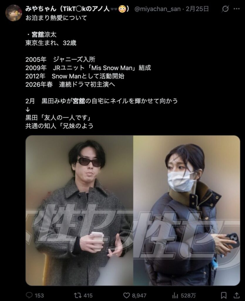 報道では、宮舘涼太さんと黒田みゆアナが交際関係にあると伝えられています。