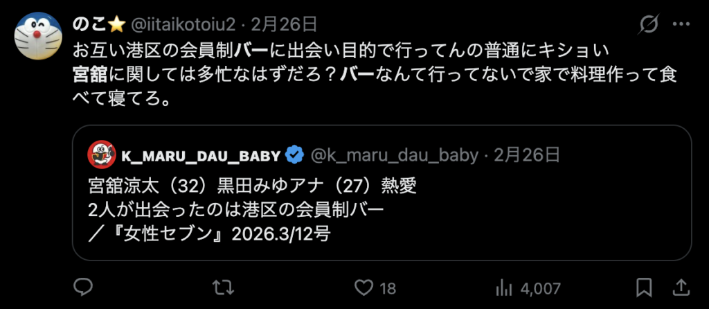 そして、ファンにとって最も気になるのが「接点のない2人がどこで出会い、誰が繋げたのか」という謎である。今週発売「女性セブン」で2人の出会いの場は「港区の会員制バー」だったと報じられ、これがX上で拡散されている。