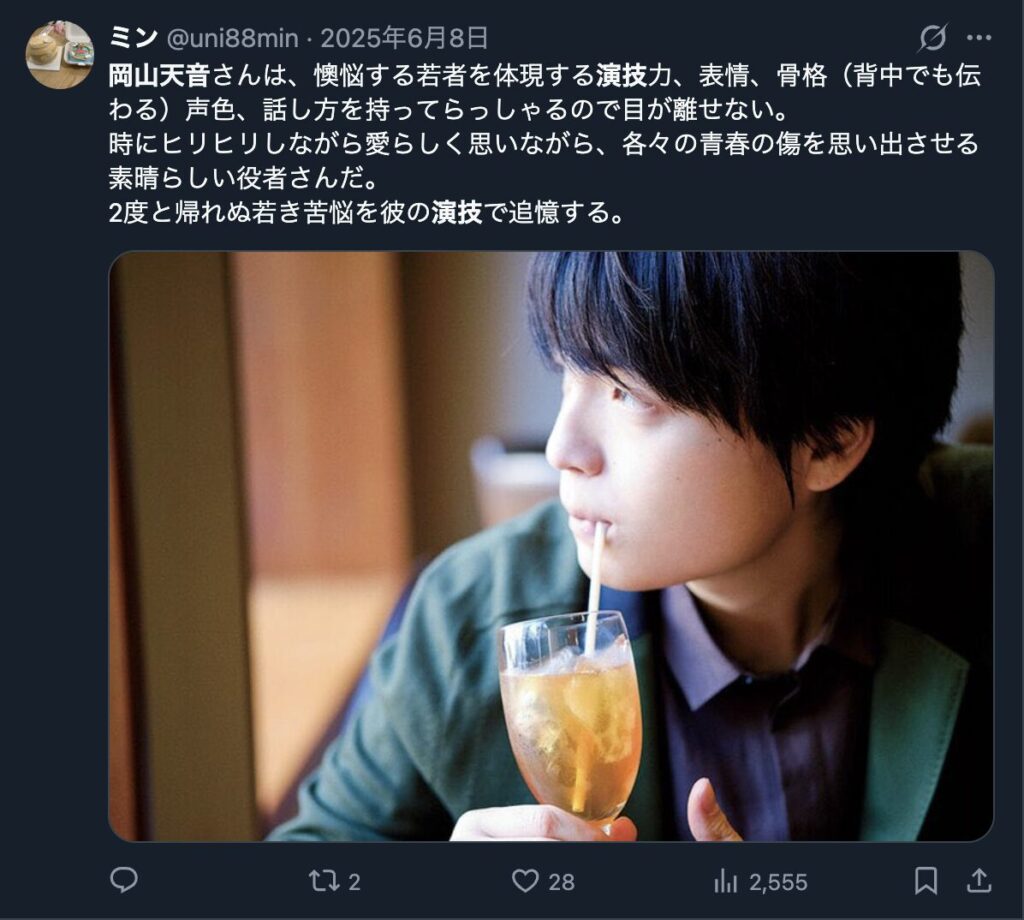 岡山天音は、圧倒的な演技力を誇示するタイプではなく、人間味を自然ににじませる表現が評価されている俳優です。役ごとに空気感を変える独特な演技が、「上手い」「個性派」「天才」といった印象につながっています。